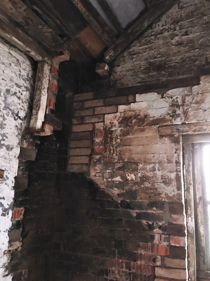 The old blocked off unsafe chimney in the old coach house upstairs, now the corner of St Saviours studio has had all the bricks removed and been made safe. The corner of the roof is now well supported and floorboards around the stone base made good. Sorry Father Christmas you can’t come down this chimney!