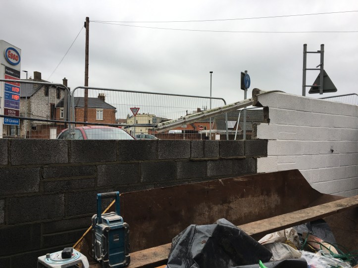 The knocked down wall has been checked over and the second panel although not knocked to the ground is damaged beyond repair so was taken down and new breezeblock wall and support pillars are beginning to take shape under Jack’s skilled hands.