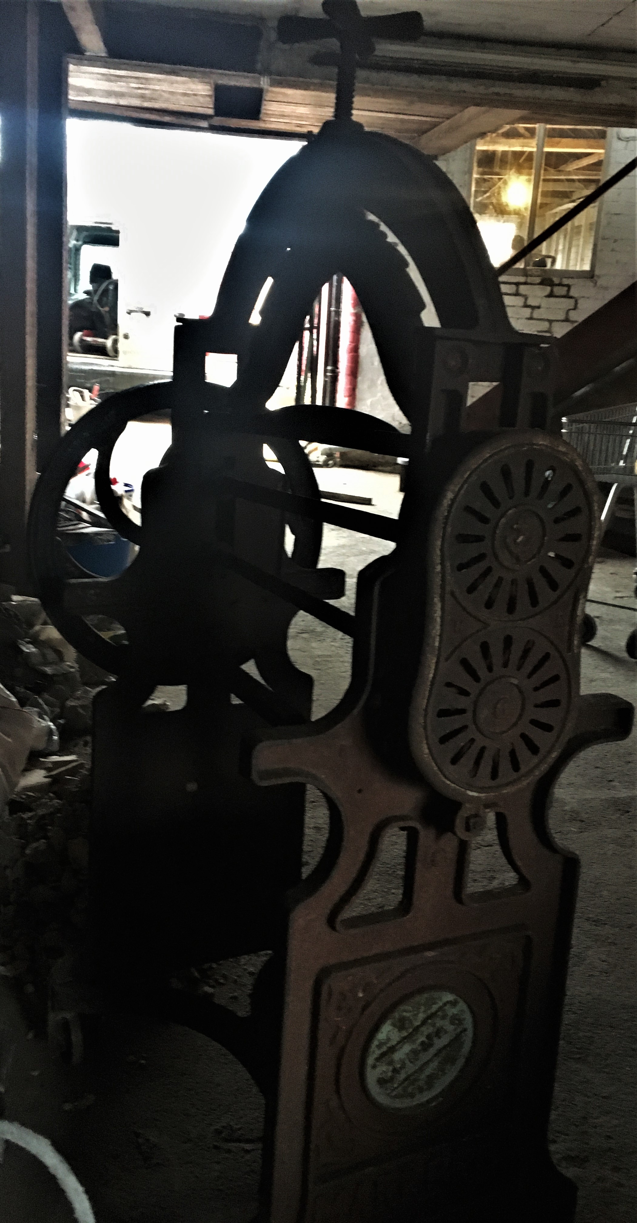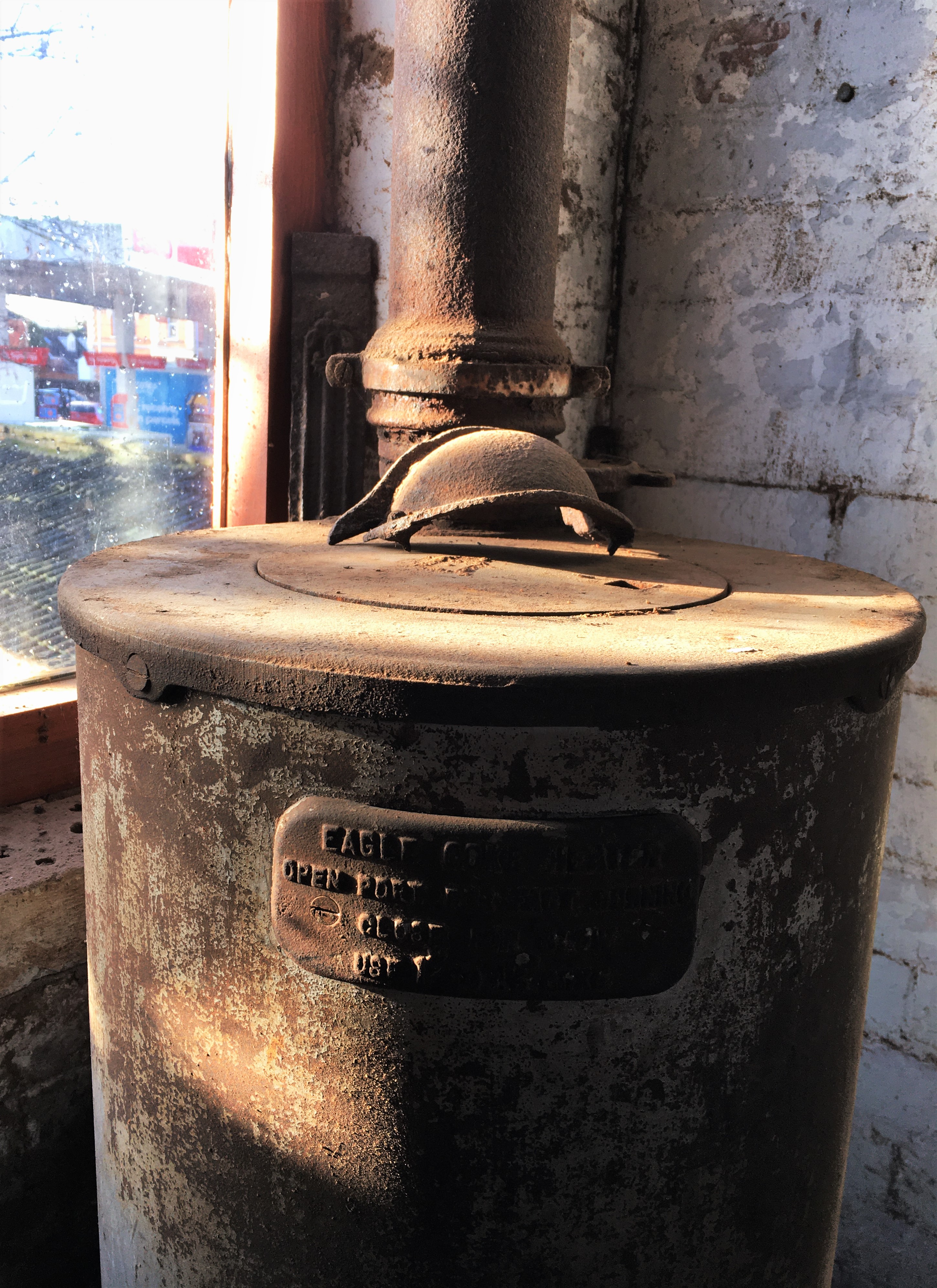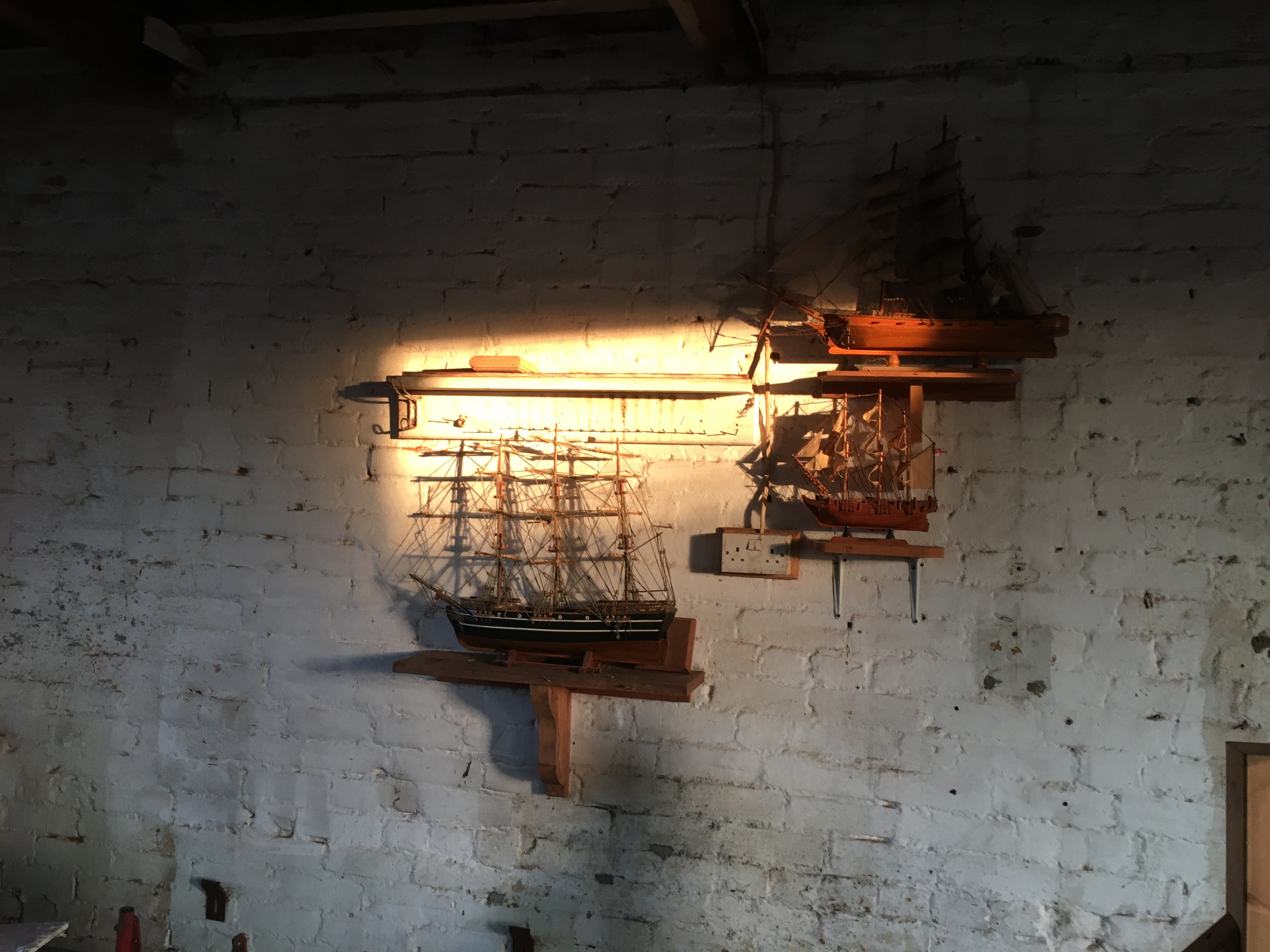 The work continues in Reception, the garage gallery, disabled loo with laying the vinyl, cutting and applying the slate skirting, The skip has helped with a tidy up and the broken wall is restored but not white just yet. Upstairs in St. Saviours studio the newly installed secondhand doors (re-use is better than recycle) are letting the light in and the setting sun was highlighting the ships over the stairs in a shaft of gold. My plan is to display some interesting objects for drawing subjects around the studio – already have the eagle burner, ships and an old mangle.