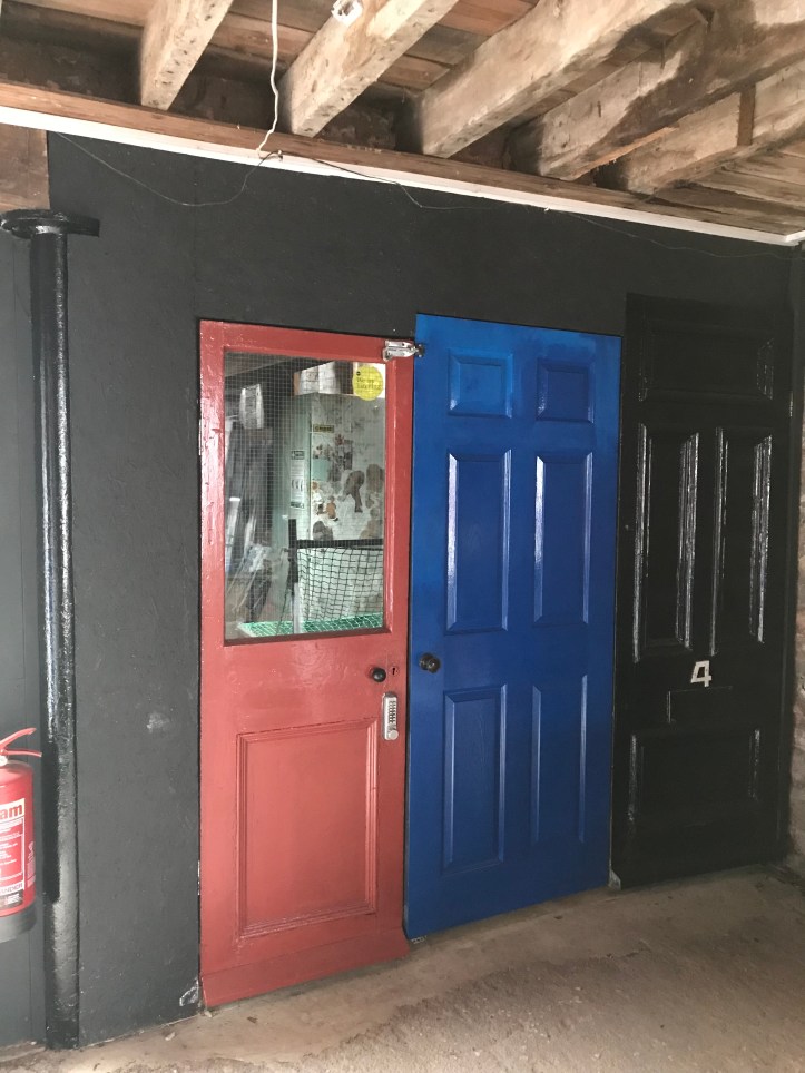Some work also nearing completion on the flat roof and upstairs porch the re-use of some old unwanted PVC windows look charming compared to corrugated clear plastic they replace. The front of the old coach house pointed and painted. First Aid corner set up in gallery, peddle bins, visitor book, payments system.